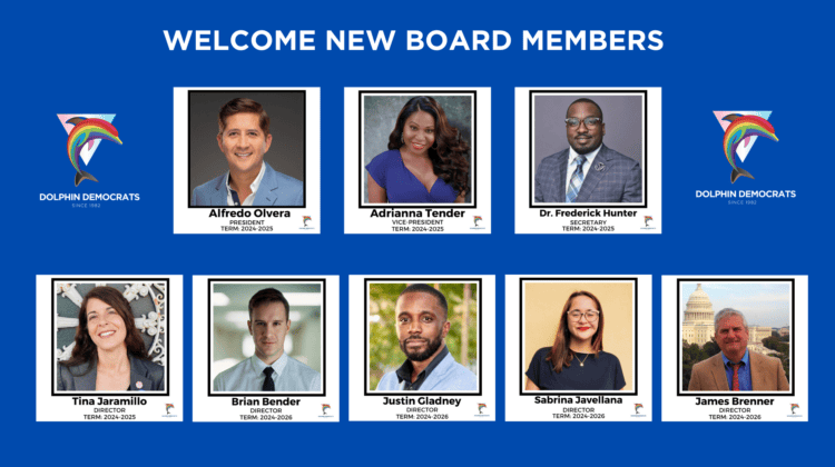 At the Annual Membership Meeting on Wednesday, February 14th, the Dolphin Democrats elected Alfredo Olvera as their President. Adrianna Tender as Vice-President, Dr. Frederick Hunter as Secretary, and Tina Jaramillo, Brian Bender, Justin Gladney, Sabrina Javellana, and James Brenner as Directors. Congratulations to our newly elected Board Members.