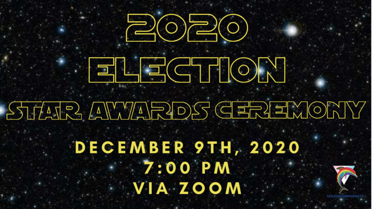 Membership Meeting & Star Awards Ceremony December 9, 2020 by Dolphin Democrats November Membership Meeting & Star Awards Ceremony Join us on Wednesday, December 9, 2020 at 7:00pm Via Zoom as we recognize members who did an outstanding job in 2020 Election Cycle. Zoom link has been emailed to all members.